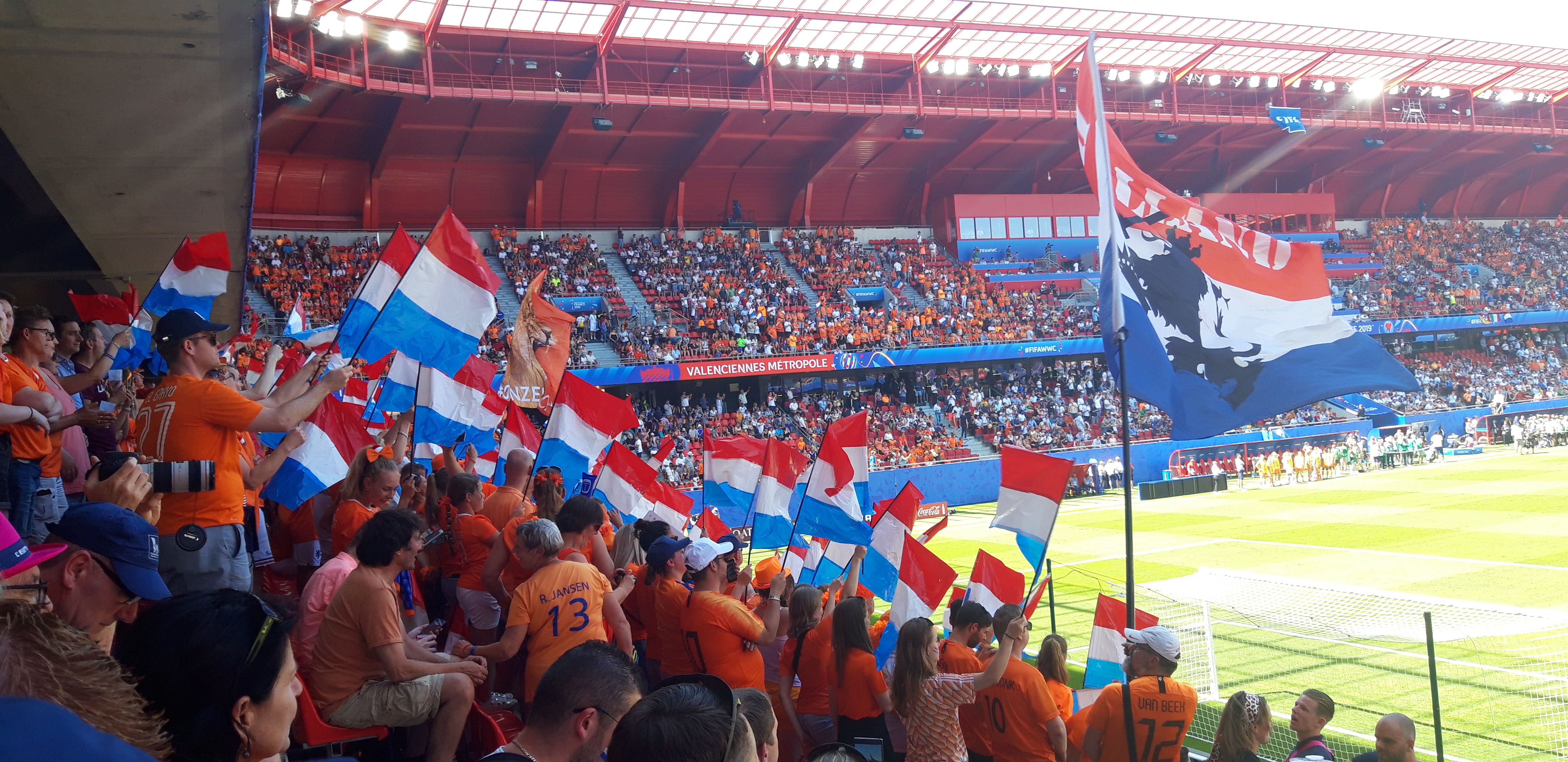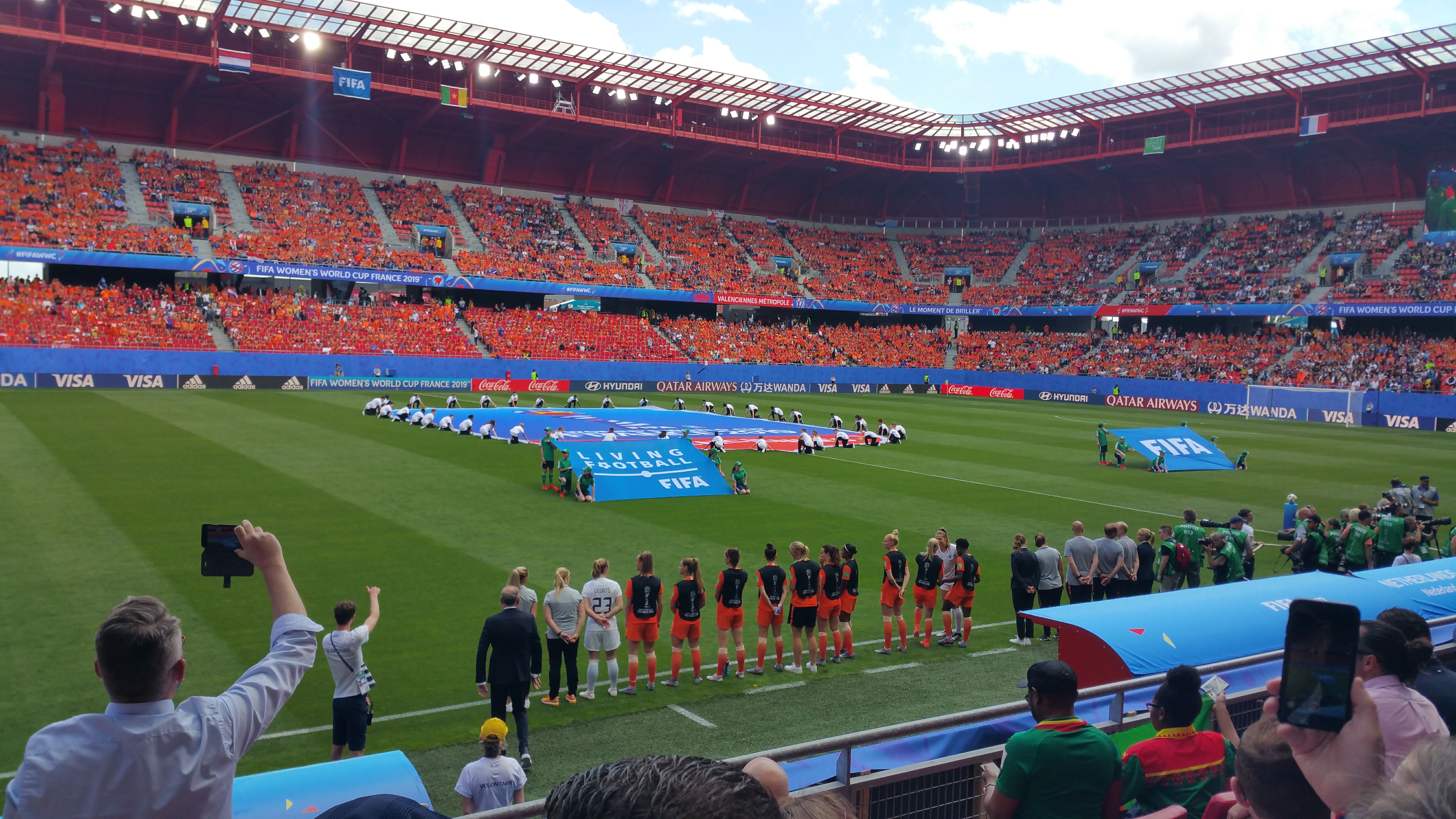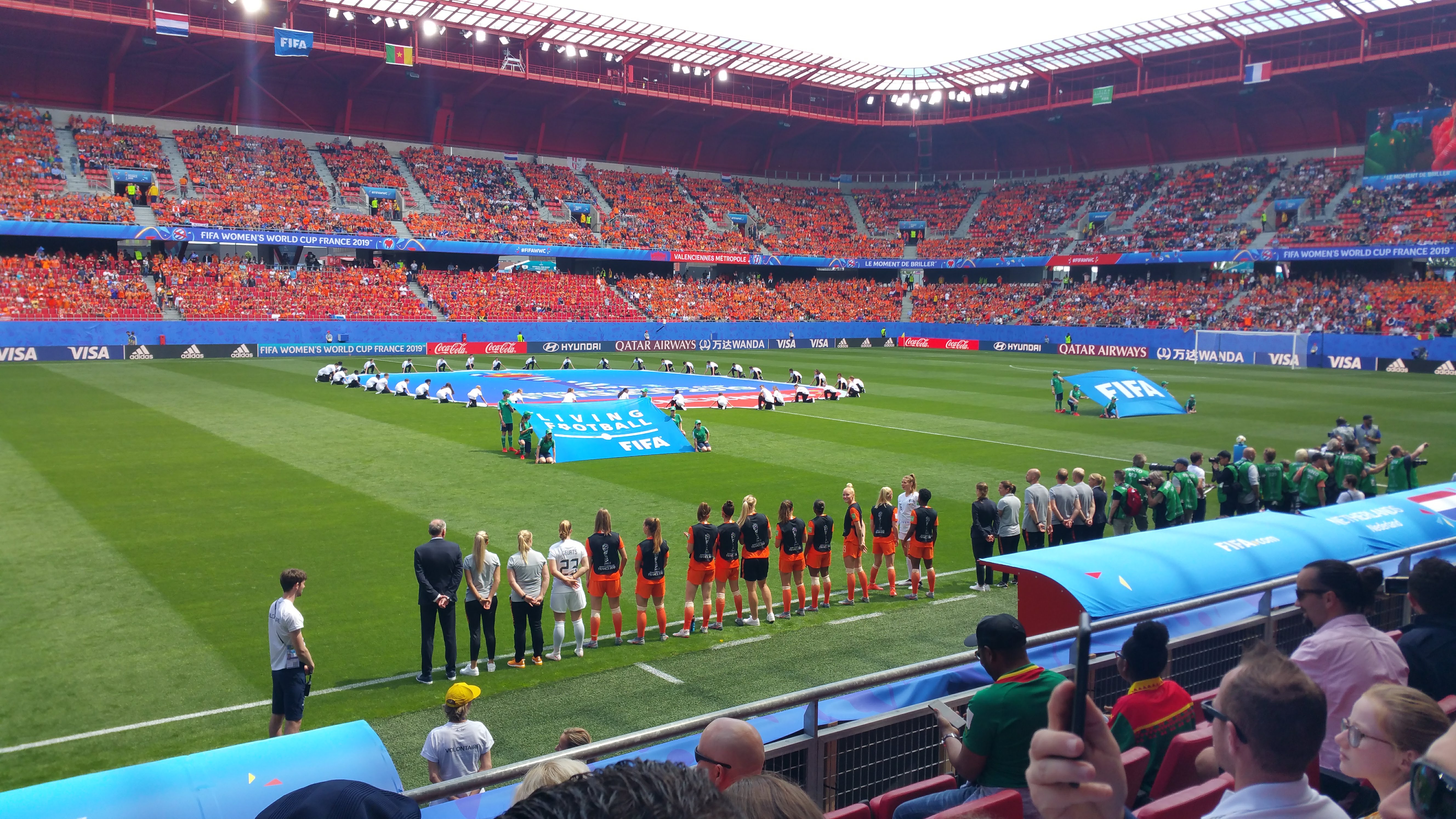 Stade de football sympa et facile d'accès. Des files d'attente énormes pour participer au match de la Coupe du monde féminine Pays-Bas contre Cameroun.
